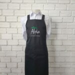 Avental frontal com regulagem na alça do pescoço e logo bordada na frente