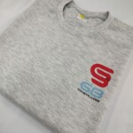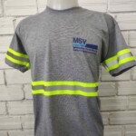 Camiseta cinza mescla, PV, com faixa e serigrafia. Uniformes Profissionais em Curitiba.