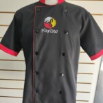 Dólmã Chef preta, manga curta com detalhes vermelho, logo bordada
