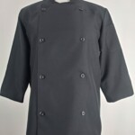 Dólmã Chef preta com detalhes e manga curta. Uniformes profissionais para restaurantes, gastronomia, chef de cozinha.
